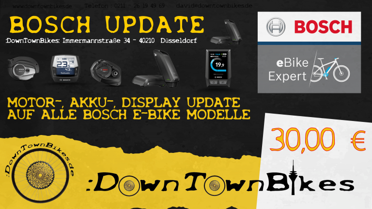 DownTownBikes führt für seine Kunden bereits ab 30,- Euro ein komplettes Update aller Bosch-Komponenten an einem E-Bike durch (Display, Motor, Akku) und bringt diese auf den aktuellsten Stand.